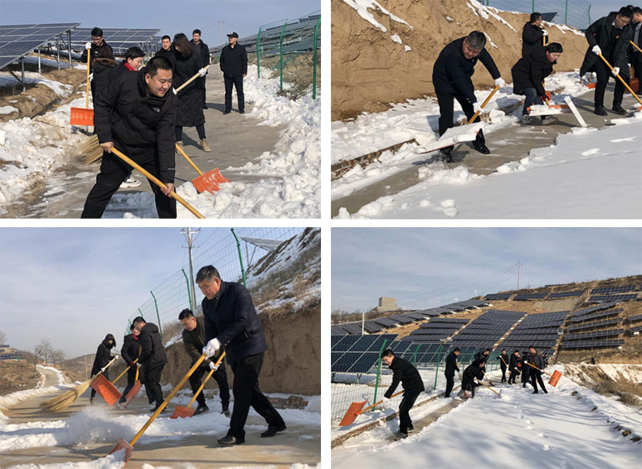 電站所有的組件上也布滿了厚厚的積雪,雪落在組件上會導(dǎo)致組件的陰影遮擋,造成組件發(fā)電量的缺失,為了避免損害光伏組件表面,大家用柔軟的掃帚掃除表面的積雪,又用布拖把等工具將表面打掃干凈??粗械姆e雪被清理干凈,大家心里很有成就感。一切為了電站的正常運(yùn)營
